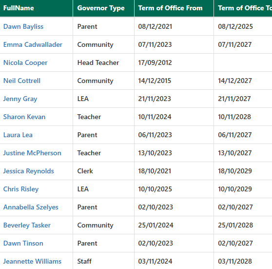 Each Governor is appointed to serve a four-year term of office. When a parent governor’s term of office ends all parents within the school receive a letter advising them that a vacancy has arisen. If a parent would like to be a governor they must complete a nomination form signed by 2 other parents and hand it in to the school office. If there are more candidates than vacancies then an election takes place. There are 18 members of the Governing Body made up as follows: –